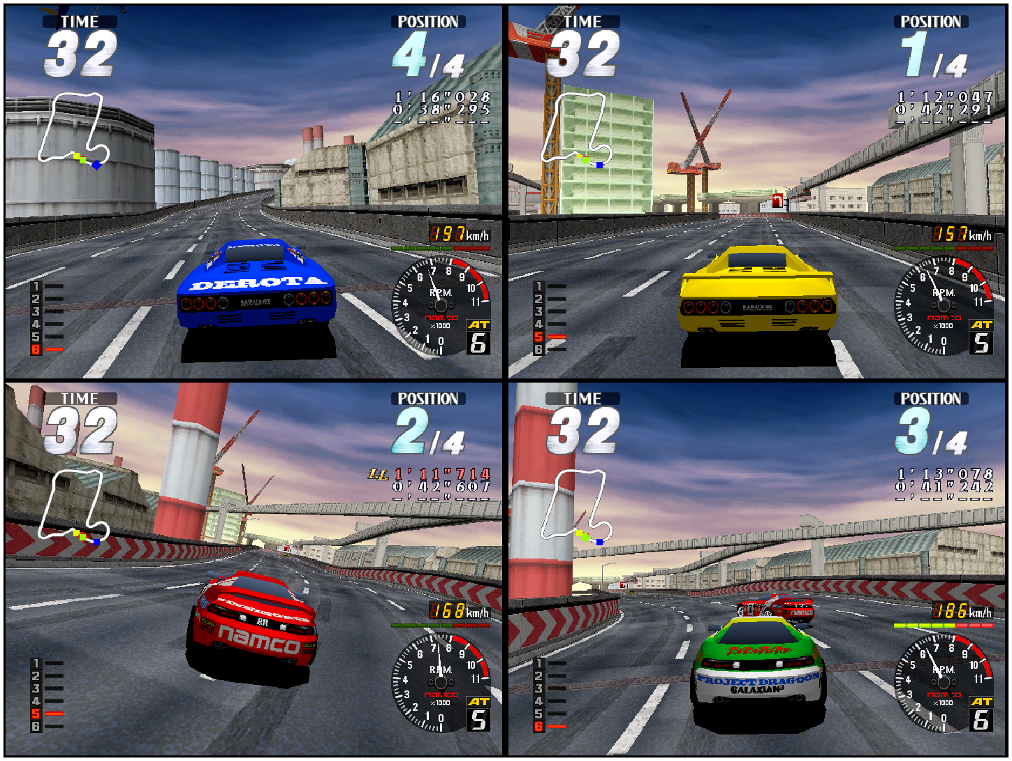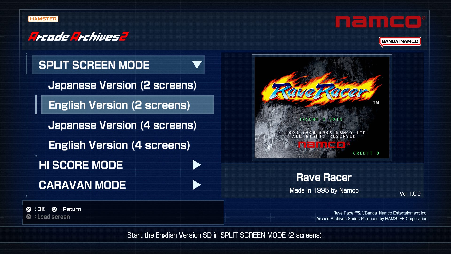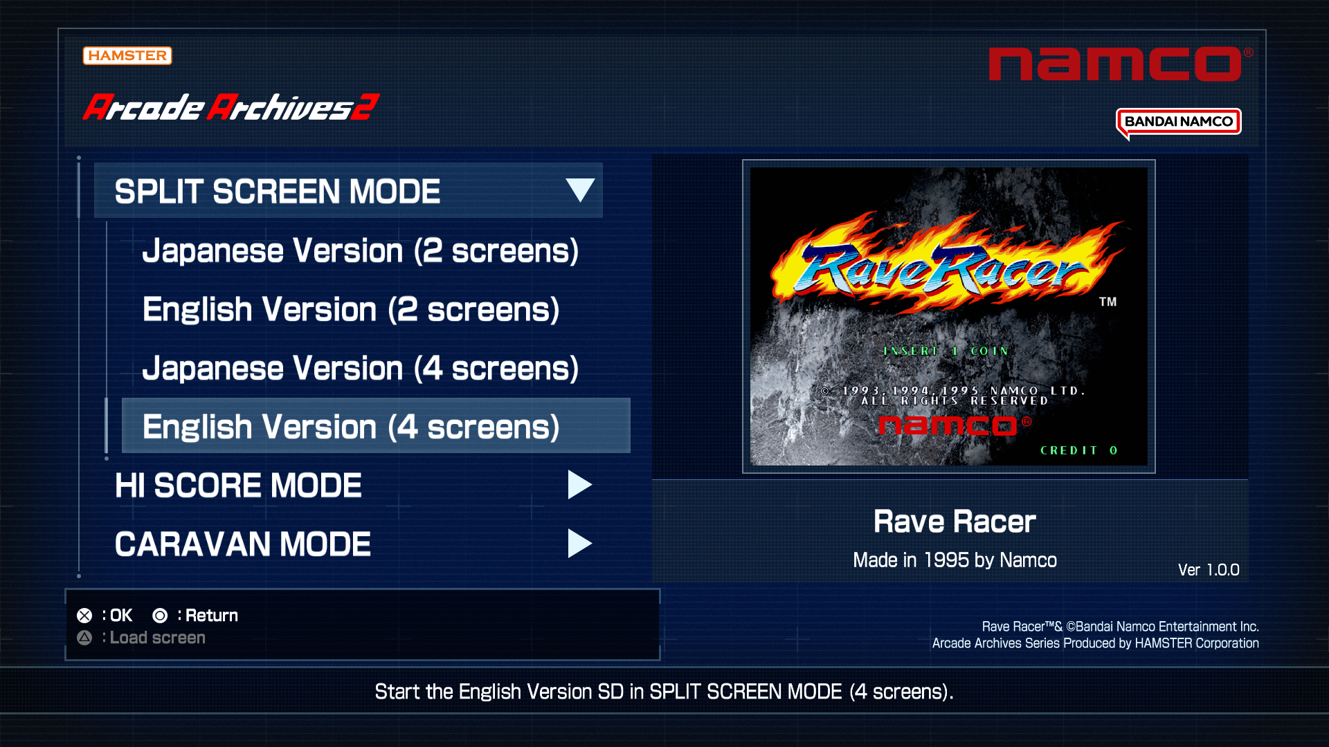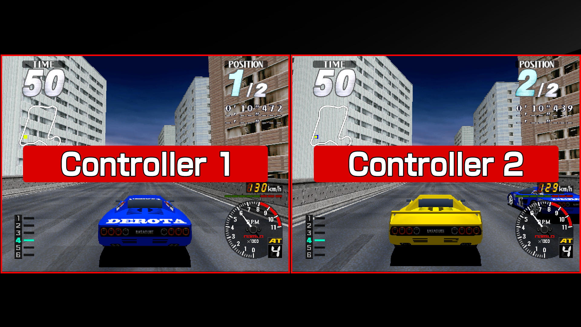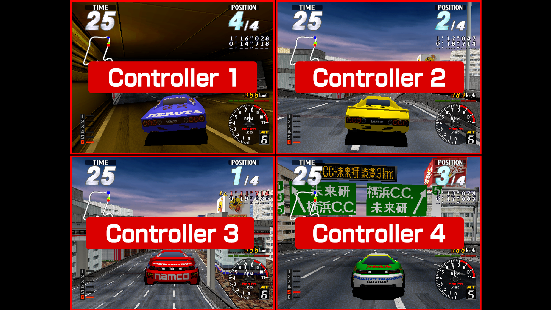 With “Arcade Archives 2 Rave Racer” SPLIT SCREEN MODE, you can choose between 2 or 4 screens for local multiplayer on a single console. For Nintendo Switch 2, you can also play in “TV Mode” or “Tabletop Mode.” Gameplay functions in this mode are the same as in ORIGINAL MODE; however, features like save/load, rewind, screen layout, and display frame settings are unavailable.