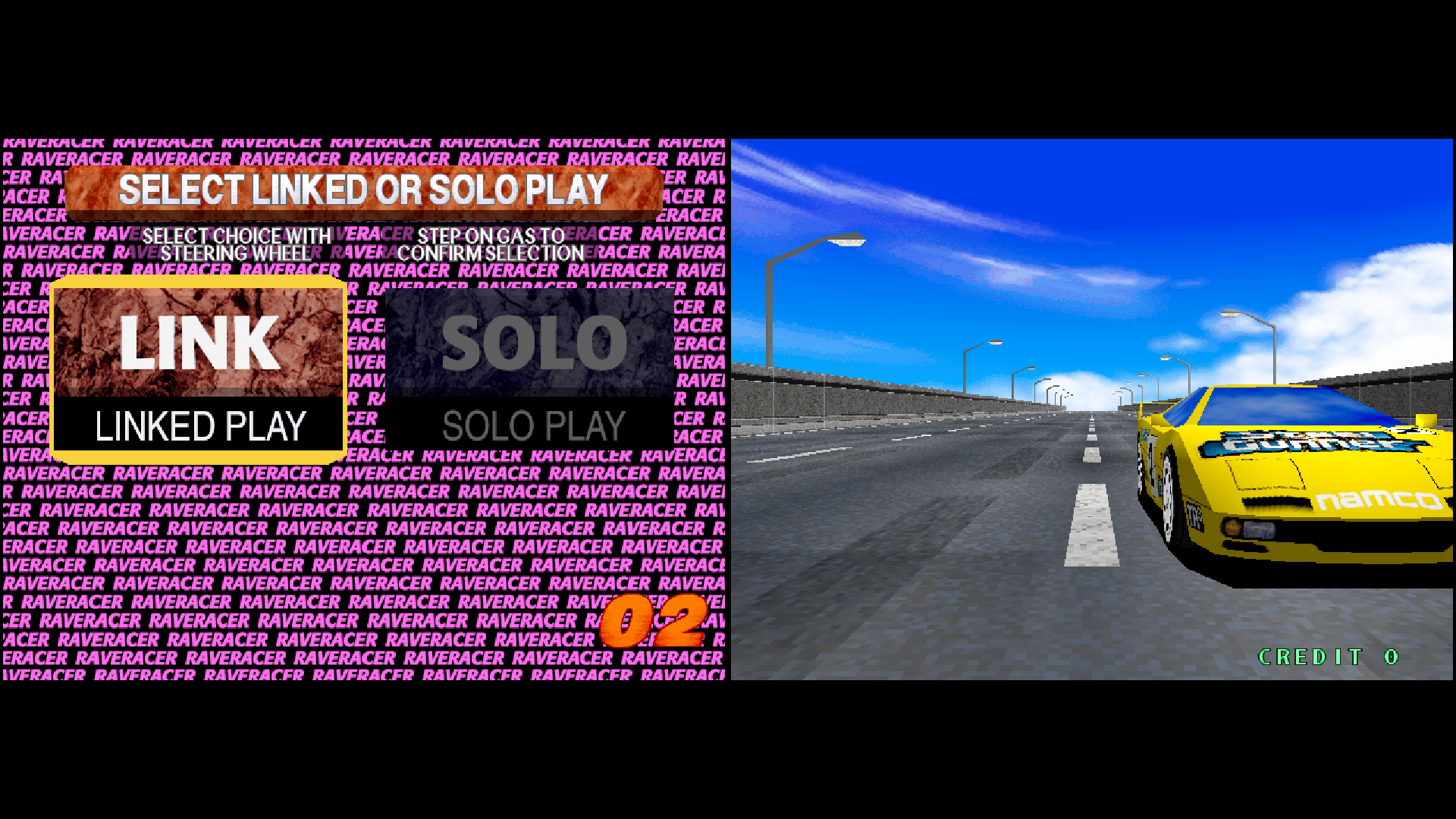 During the opening demo, press the [Add Credits] button to bring up the screen where you can choose LINKED PLAY or SOLO PLAY. Select “LINK” and press the [Accelerator] button. Once one player selects “LINK” the other screens will display “JOIN IN!”