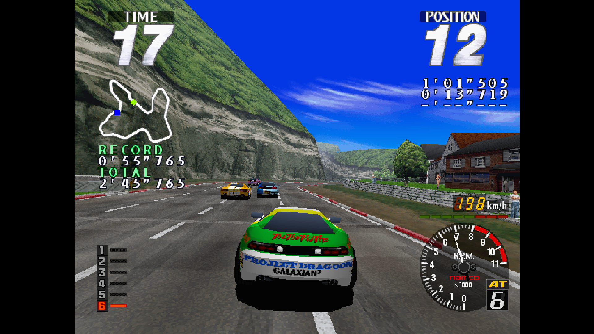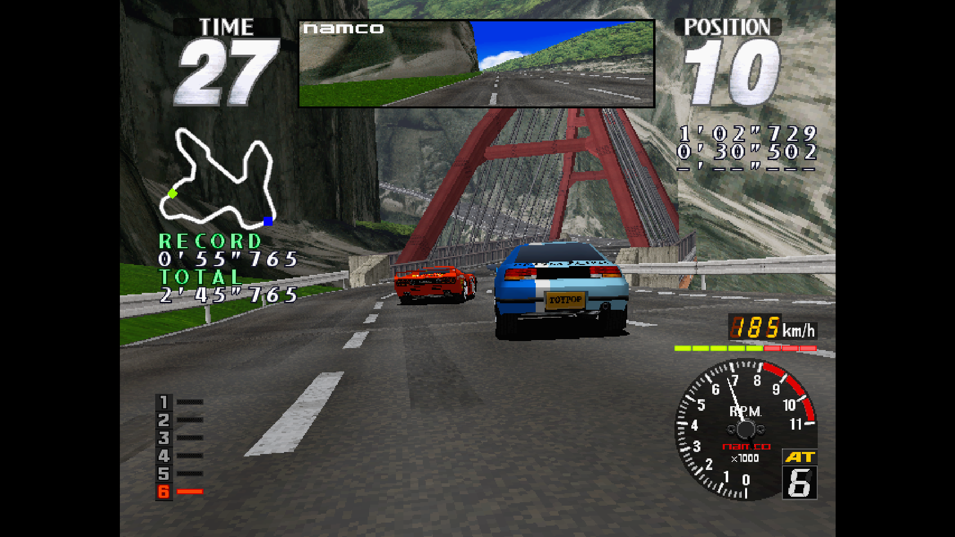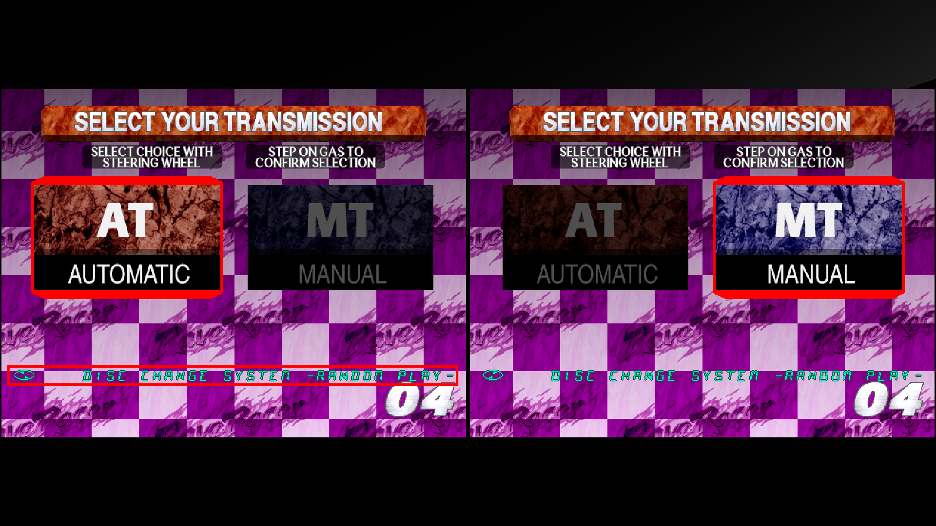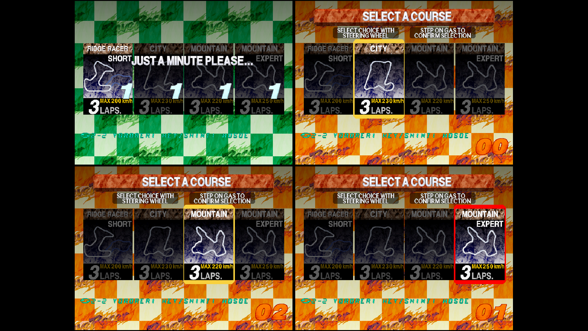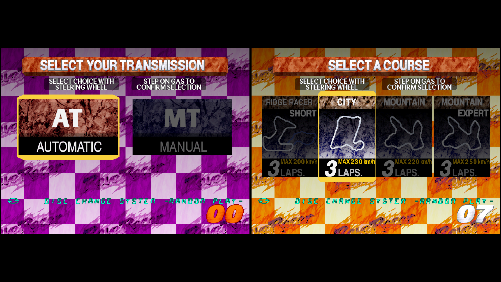 On the transmission selection screen, use the steering wheel to choose either AT AUTOMATIC or MT MANUAL, and press the [Accelerator] button to confirm. On the course selection screen, use the steering wheel to choose your preferred course from RIDGE RACER SHORT (Beginner), CITY (Intermediate), MOUNTAIN (Advanced), or MOUNTAIN EXPERT (Course with trailing car speed-boost effects disabled), then press the [Accelerator] button to confirm. The course is decided by player voting. If the votes are tied, one of the selected courses will be chosen at random. Once the course is decided, the race will begin.