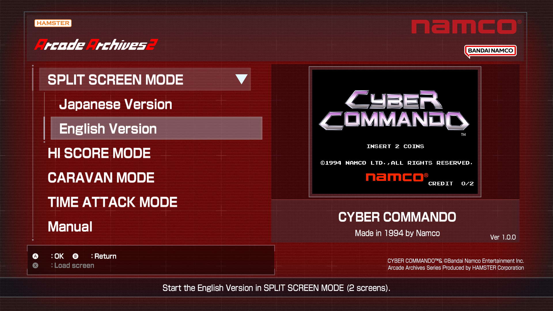 In Arcade Archives 2 CYBER COMMANDO, you can enjoy split-screen local multiplayer (versus play) with just 1 console and 2 controllers. For Nintendo Switch 2, you can also play in “TV Mode” or “Tabletop Mode.” Gameplay functions in this mode are the same as in ORIGINAL MODE; however, features like save/load, rewind, screen layout, and display frame settings are unavailable. To start local multiplayer (versus play), go to the title screen and choose “Japanese Version” or “English Version” in SPLIT SCREEN MODE. The first controller’s display (1P) is shown on the left, and the second controller’s display (2P) is shown on the right.