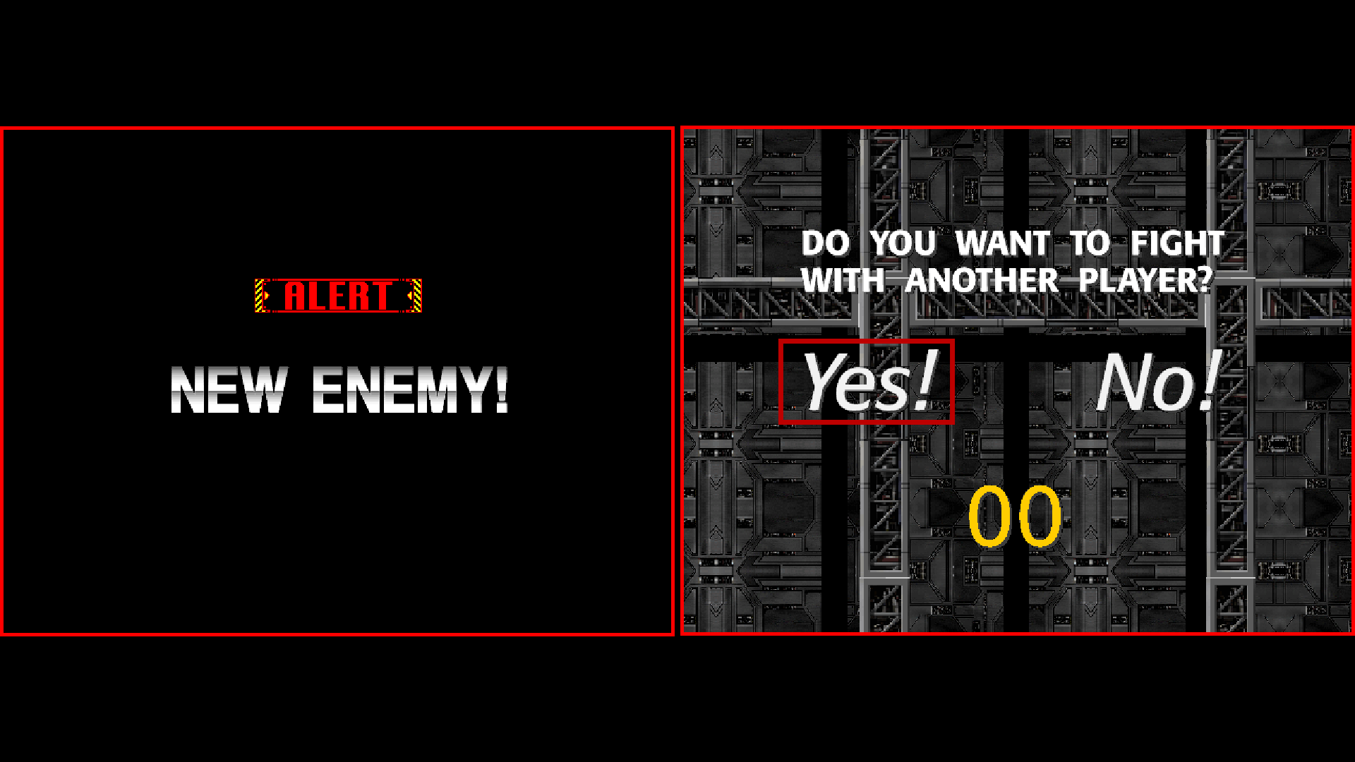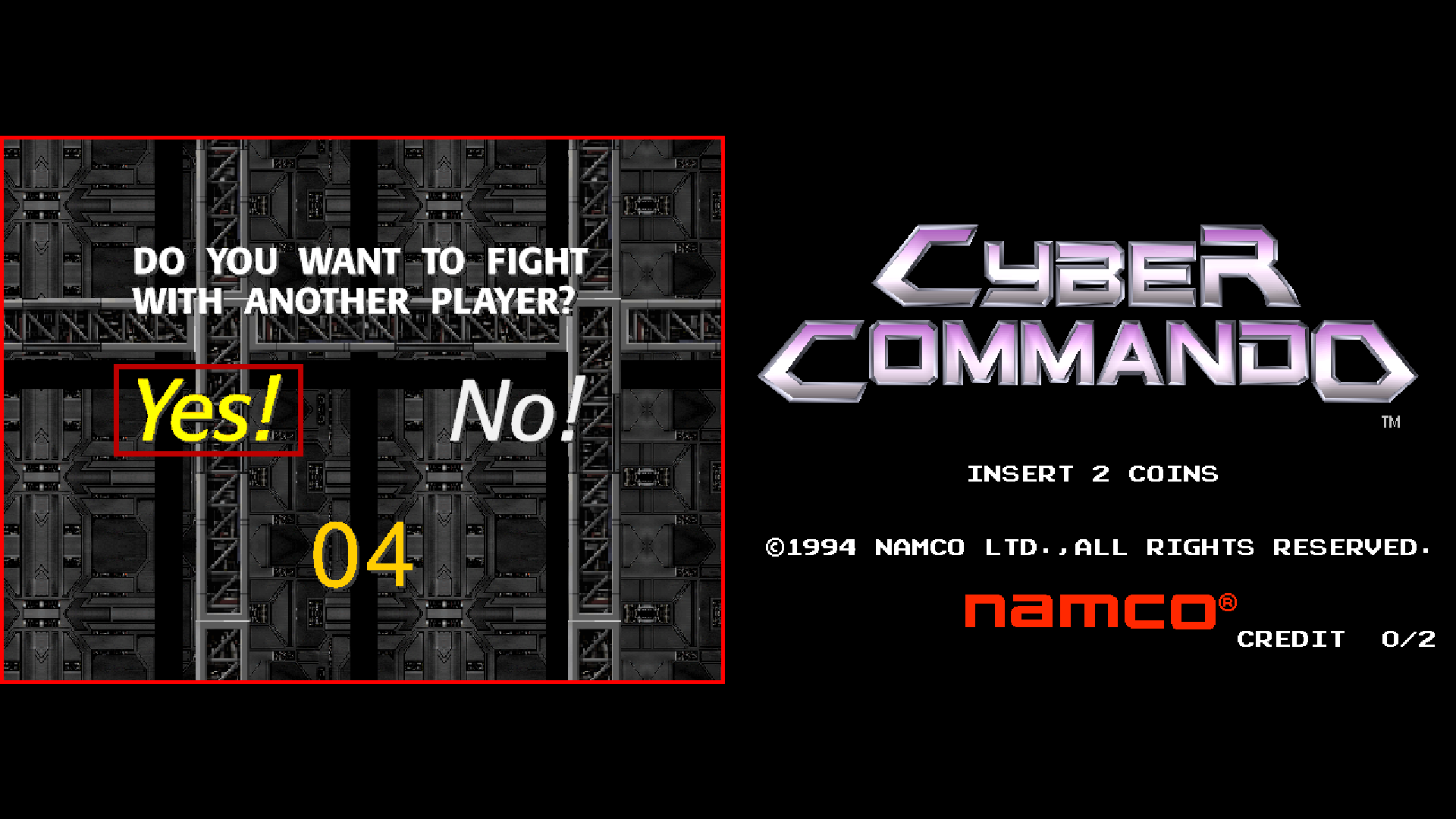 During the opening demo, press the INSERT COIN button twice to bring up the “DO YOU WANT TO FIGHT WITH ANOTHER PLAYER?” screen. Select “Yes!” on both the 1P and 2P screens to start the game.