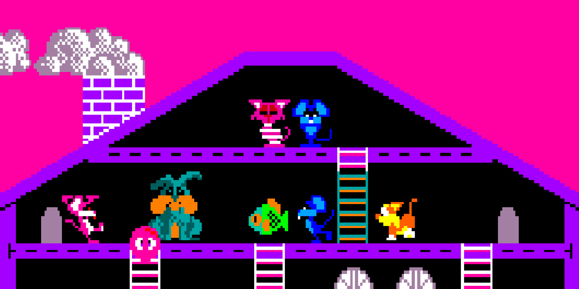 “MOUSER” is an action game released by UPL in 1983. Take control of the tomcat Nyanta and rescue his lover Mariya from her mouse captors! The tricky mice will come at you with all sorts of surprises. Nyanta will need all your luck and help to make it back with his fiancée!