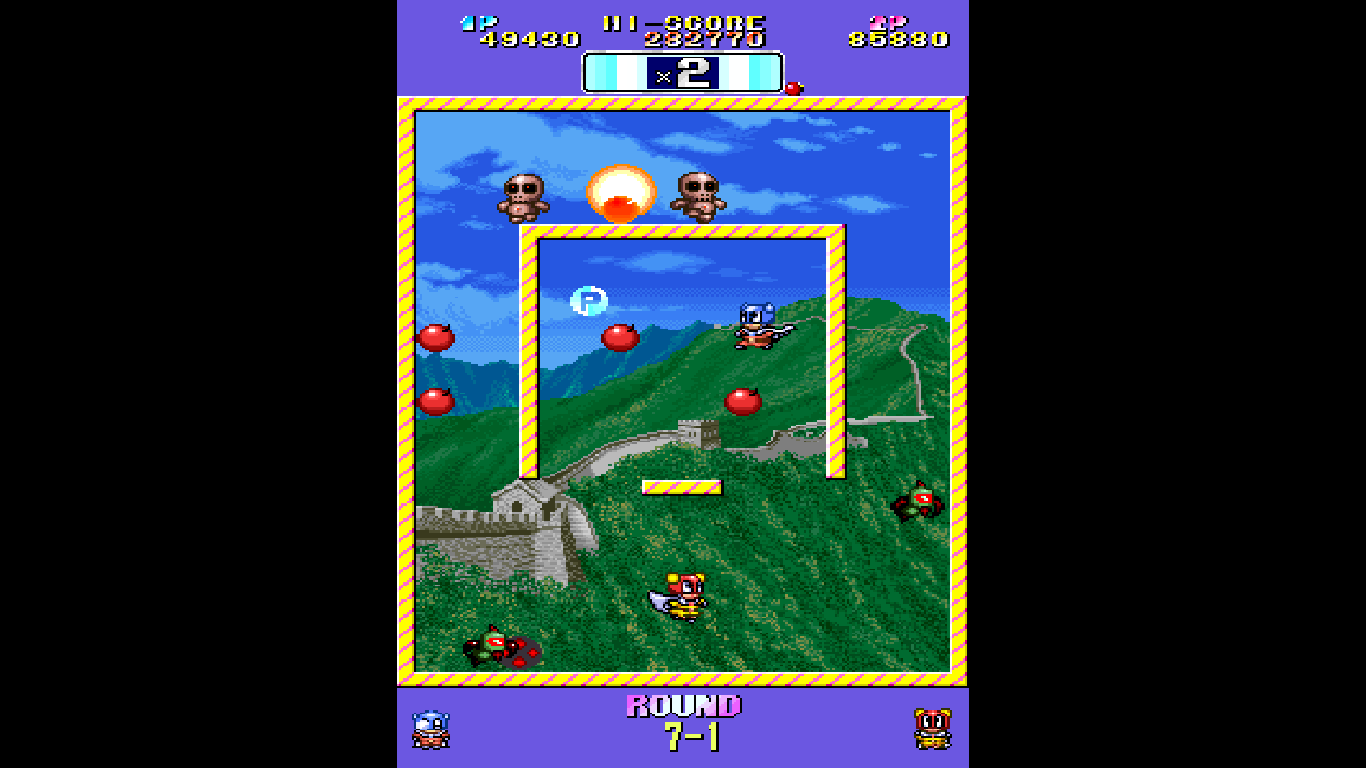 敵の攻撃をくぐり抜け、ステージ上の爆弾をすべて回収しましょう。火が点いた爆弾を優先して取れば、ハイスコアのチャンス!