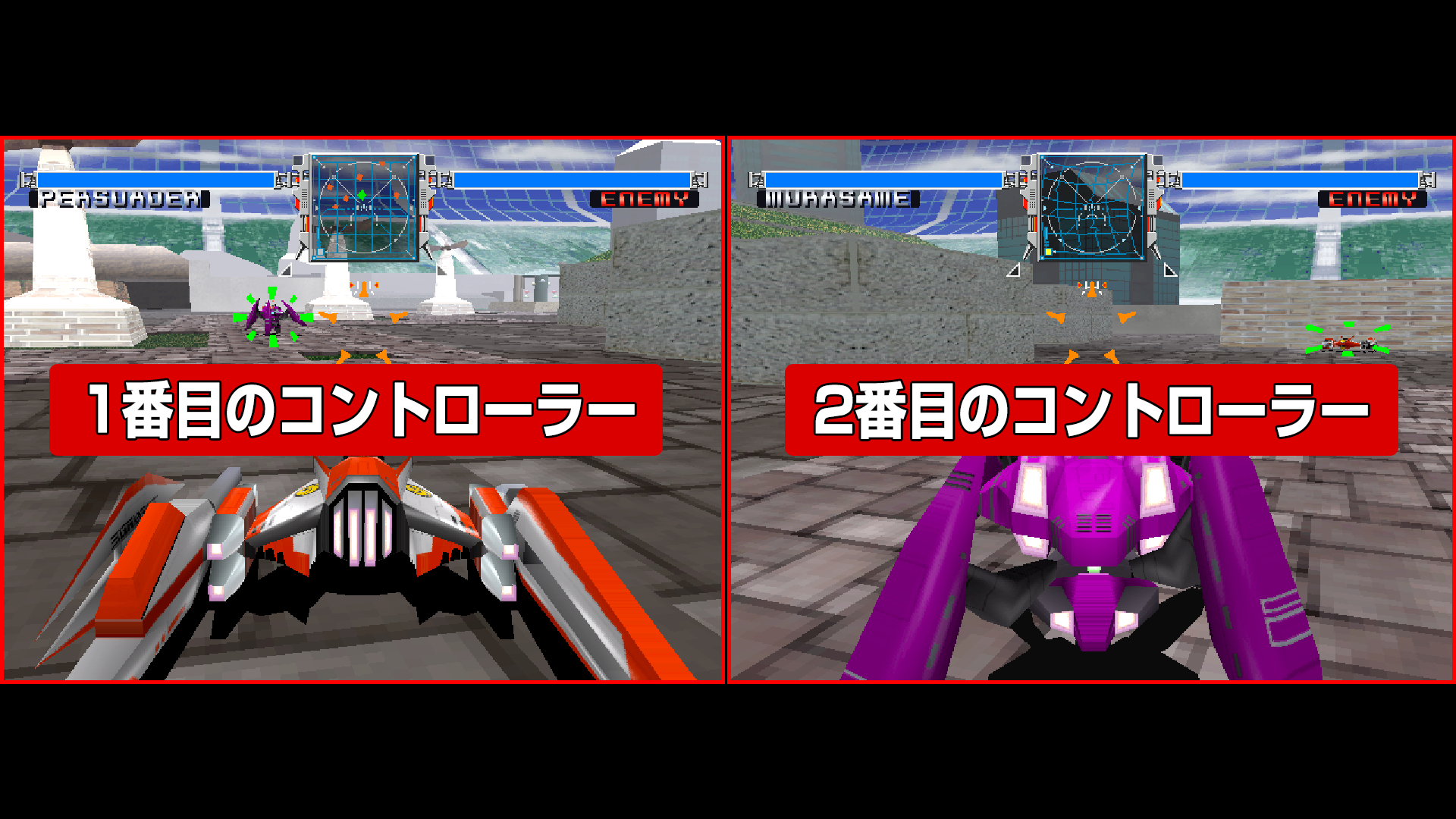 対戦プレイをするには、タイトル画面から[マルチスクリーンモード]の[国内版]か[海外版]を選択してください。1番目のコントローラー(1P)は左の画面、2番目のコントローラー(2P)は右の画面を操作することになります。マルチプレイ(対戦プレイ)について
