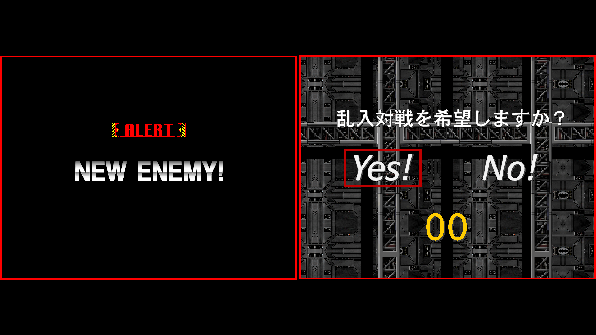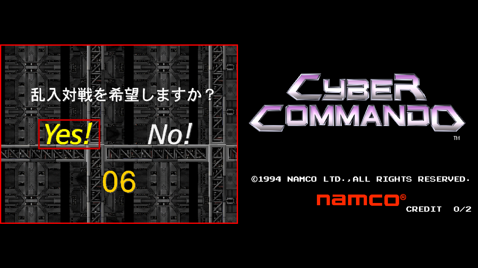 オープニングデモの再生中に「クレジット追加」ボタンを2回押すと、【乱入対戦を希望しますか?】という画面が表示されます。1Pと2P両方の画面で「Yes!」を選択してゲームを開始してください。