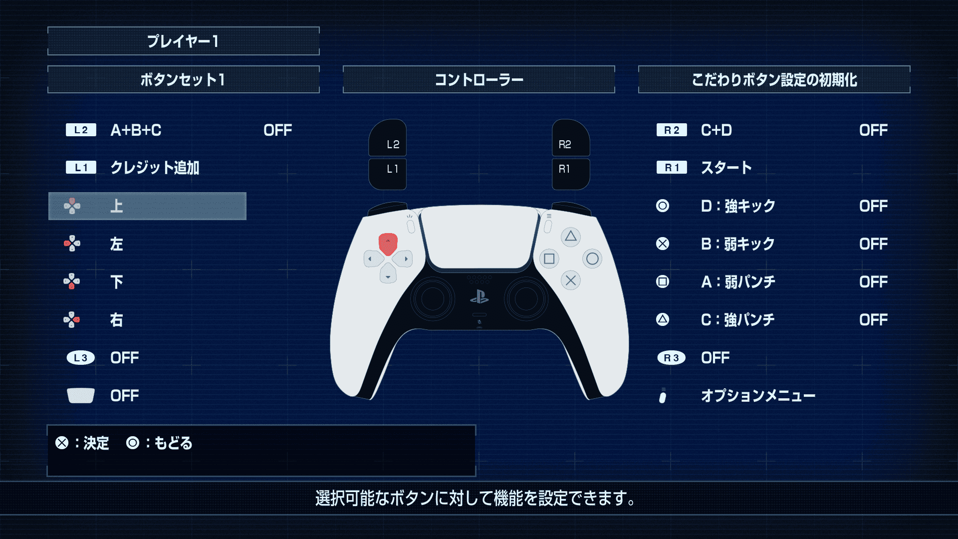 ボタン設定では、方向キーを含めた各ボタンごとの割り当てを変更したり、アーケードコントローラー用にカスタマイズされたボタン配置の初期設定に変更したりすることができます。
