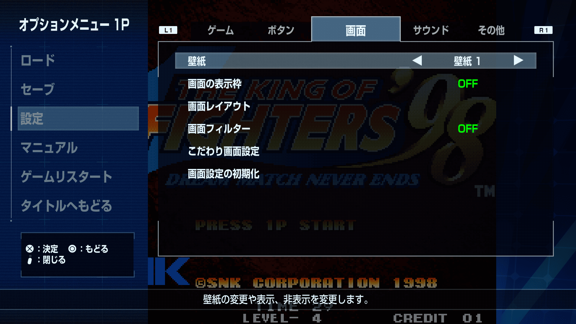 | オプションメニュー | 〇 ゲームが停止する | ◎ ゲームが継続する (オリジナルモード以外) |